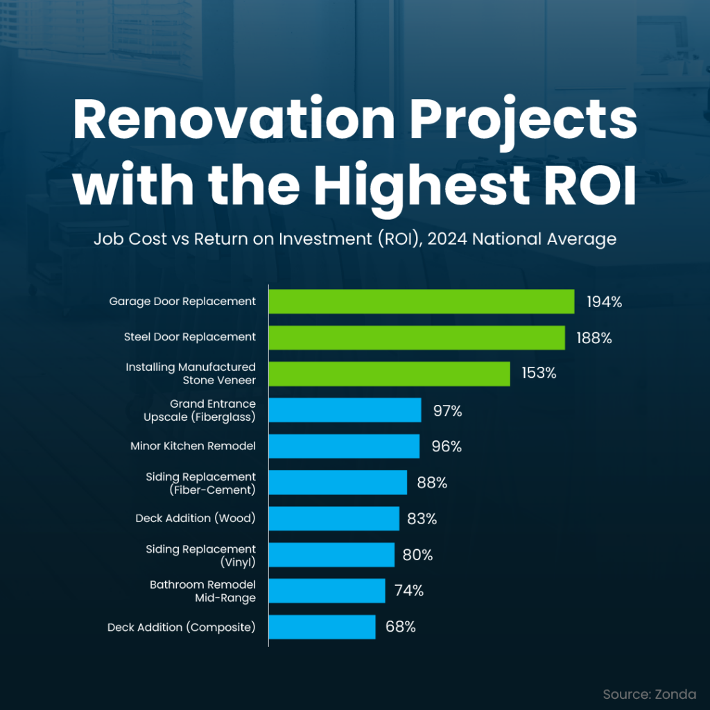 An agent’s expertise is key in narrowing down your list to what’s actually worth it. They know what buyers in your area want and they also have data like this report from Zonda to guide you on which updates have the best ROI (see green in the graph below):